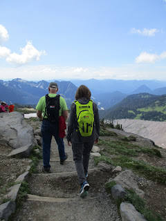 We drove early to meet M&D at their B&B near the park entrance. Good timing! the parking lots and trails filled up more that i ever would have imagined. R had come down just a few months earlier to hike to Camp Muir and was surprised to see parking lots where snow had been previously. We hiked to Pinnacle Peak without realizing that it was categorized as a "Strenuous" trail. gorgeous though! we all made it to the top for an amazing lookout. the skies clouded up after our hike, so the views weren't as clear later.